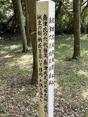 志布志城内城跡本丸 島津氏六代氏久公居城の標柱。「島津氏の六代当主、島津氏久は志布志城に居城し城主の新納氏を率いて日向・大隅を治めた。」と書いてある。