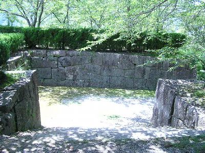 松ノ丸から大手道を降りる。船着場が現存しているらしい(あと、炭納屋が発掘調査中)水の手郭への道は崖崩れのため通行止めになっていた。