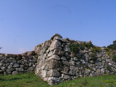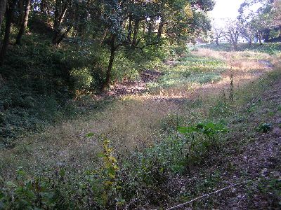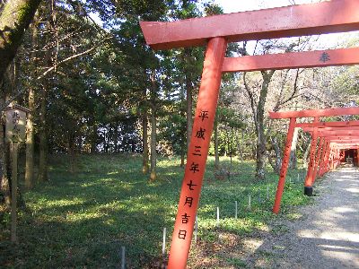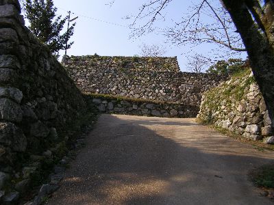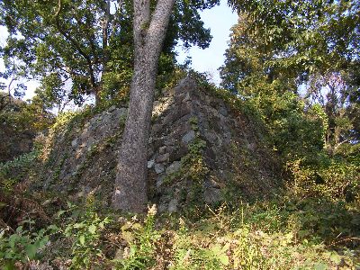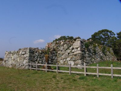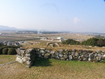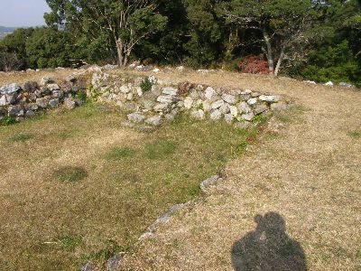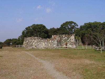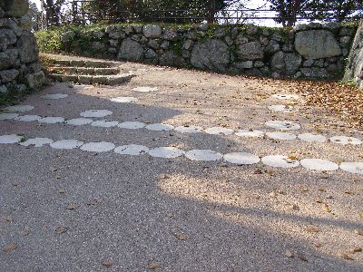 この敷石は発掘調査で見つかった門の礎石のあった場所を示している。