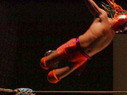 佐々木と鳥羽、先制攻撃をかけてアジアン・エキスプレスを場外に落とすとプランチャ競演(左写真)、しかしこれはアジアン・エキスプレスにかわされる。