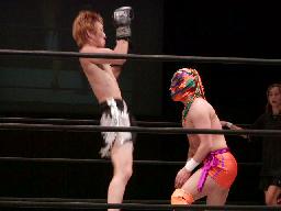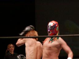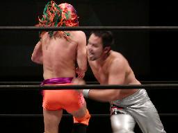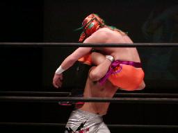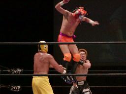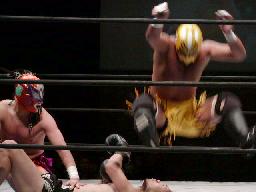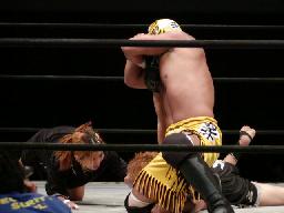 コンドルストレッチからグラウンドに持ち込んでエビ固め、カウント2。腕を固めて変形のバックドロップ、クーガーにタッチ。コンドルが鳥羽の腕を固定、クーガーがそこ目掛けてギロチンドロップ。鳥羽の首をエプロンから出してトップロープ越えギロチン。クーガーとコンドルはダブルのフェースクラッシャー。鳥羽はパンチからバックブロー、しかし腕を痛めつけられて威力なし。さらにパンチの連打からカバー、カウント2。鳥羽パンチ連打。コンドルがコーナーからミサイルキックでクーガーをヘルプ(右写真)。