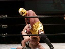 佐々木コーナーに振って串刺しニーアタック。コーナーに上げてから持ち上げてランニングライガーボム(左写真)、カウント2。