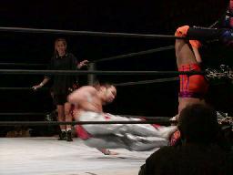 クーガーバックブローかわしサイドバスターの体勢から一回転させて顔面から落とすと再度クーガーロック2(右写真)。コンドルが必死に佐々木をロープ際で押さえる。粘った鳥羽もついにギブアップ。