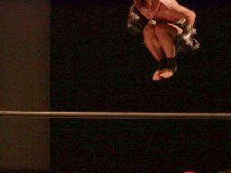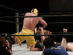 コンドルが佐々木を場外に落とし、場外でペンデュラムバックブリーカー。そこにクーガーがロープを超えてのギロチンドロップ(右写真)。