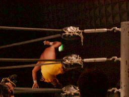 クーガーリングに戻り鳥羽にツームストーンドライバー、コブラツイスト(左写真)引き倒してフォールの体勢に、カウント2。コンドルにタッチ。10分経過。