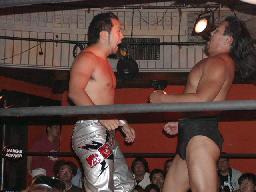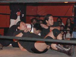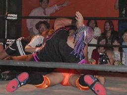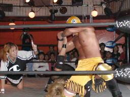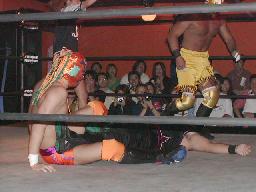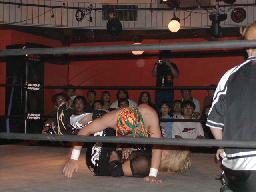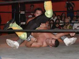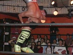 クーガーが戻る。クーガー腕ひねる、コーナーに振る、MIKAMIジャンプしてクーガーの突進かわしてフランケンシュタイナー。MIKAMIコーナーに振る、クーガー切り返して飛びつくとモンキーフリップ、MIKAMI着地。クーガーはコンドルにタッチ。コンドルロープに振って逆水平。コンドルボディプレス(左写真)、カウント2。コンドルロープに振る、MIKAMI切り返してドロップキック、宇宙にタッチ。