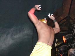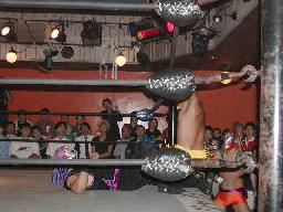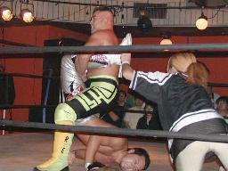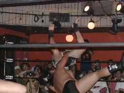 さらに宇宙の首をエプロンから出してもう一発ロープ越えギロチン(左写真)。クーガーテキサスクローバーリーフで締め上げる。コンドルにタッチ。