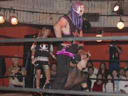 MIKAMIロープに振ってドロップキック、エルボードロップ、後ろ飛びのセントーン。ボディスラムからコーナーに上ってダイビングセントーン(右写真)、カウント2。10分経過。