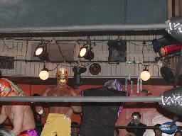 宇宙首投げからスリーパー、すぐにワキ固めにスイッチ(左写真)。リリースしてストンピング。ヒザ蹴り打ち込んでコーナーに振ると串刺しラリアット。対角線コーナーに振る、コンドルコーナーに飛び乗ろうとするが失敗。一旦間を取ってコンドルタックルに行くが宇宙難なくこれを切ってスリーパーからワキ固め。クーガーがカット。宇宙コーナーに振る、コンドルコーナーに飛び乗って(今度は成功)、反転クロスボディ。飛びついてウラカン・ラナ、宇宙1で返す。5分経過。