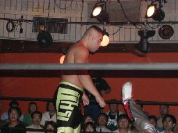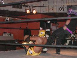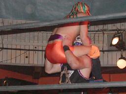 宇宙ミドルキック連打からサッカーボールキック、コンドルのたうち回る(右写真)。宇宙ブレーンバスターからカバー、カウント2。