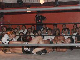 佐々木コーナーに振って串刺しエルボー、鳥羽も佐々木の背中を踏み台に串刺しの飛びヒザ蹴り。藤沢をコーナーに逆さ吊りにしてダブルのスライディングキックを顔面に。佐々木が鳥羽を持ち上げてパワーボムの要領で藤沢の上に落とす。次は鳥羽がウラカン・ラナで佐々木を転がしてサマーソルトドロップ?これが「空回り」の由来?めげずに佐々木が鳥羽をリバースブレーンバスター、鳥羽はムーンサルトプレスの形で藤沢を押さえ込む(右写真)、カウント2。佐々木が鳥羽をコーナーに上げる。雪崩式ブレーンバスター式ローリングセントーン?石井が阻止。石井は佐々木をキック、ラリアットで場外に落とし、さらに鳥羽をリフトアップしてトップロープ越しに投げつける。藤沢ここでようやく石井にタッチ。