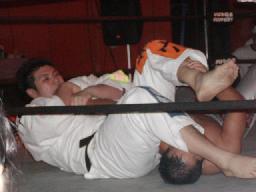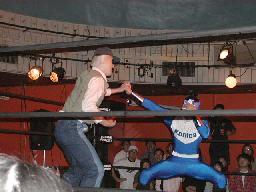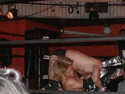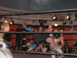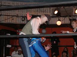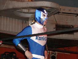 エロエロコーナーに振る、コニカマンコーナーに飛び乗って反転ミサイルキック、エロエロハタキ落とす。エロエロコブラツイストに固める。空いた右手がいやらしくコニカマンの股間に迫る(左写真)。これは精神的ダメージを狙った?で、油断してるとストレッチボム。