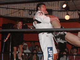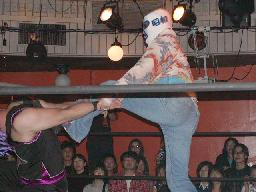 エロエロロープに振る、コニカマン切り返してドロップキック(右写真)。コニカマンロープに振ってすくい投げ、エロエロブロックして逆に投げる。エロエロねじ伏せてチョーク攻撃。ロープに振ってエルボー。エロエロ抱え上げるとストマックブロック、カウント2。さらにしつこくカバーに。いずれも2。
