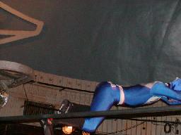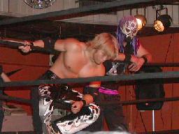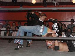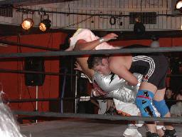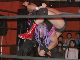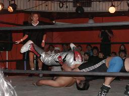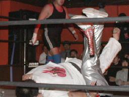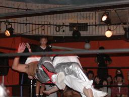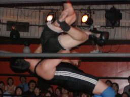 ロックアップ、80はいつものようにパッと離れてVサイン。やる気をそがれるMIKAMI。手四つに組むと80はコークスクリューシザーズ(右写真)。MIKAMIヘッドロック、80ロープに振る、MIKAMIリープフロッグ、80かがみ損ねたか激突。合わないのか?MIKAMIロープに振ってドロップキック、宇宙にタッチ。