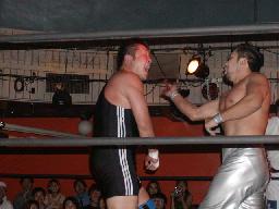 佐々木逆水平、前川もチョップで返す。チョップ打ち合いから張り手合戦に(右写真)。佐々木は前川の張り手かわしてジャーマン。前川をコーナーに逆さ吊りして鳥羽と2人でボディにキック、距離を取ってダブルのスライディングキック。