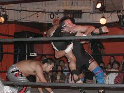 前川ゴア。前川距離を取ってもう一発ゴア、佐々木受け止める。橋本が体重浴びせ掛けて倒す(右写真)。いつもとは逆の連係。カバーは鳥羽がカット。その鳥羽を橋本がジャーマン。