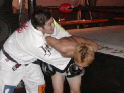 エロエロカメラマン男は手四つと見せかけて片手に持ったフジのカメラでフラッシュ攻撃(右写真)。コーナーに振ってキック、パンチ。ロープに詰めてヒザ蹴り。