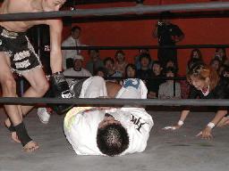 橋本払い腰、佐々木投げられながらも逆に十字に。前川がカット。前川スロイダーで投げる。橋本払い腰から十字(左写真)、鳥羽がカット。前川は鳥羽をジャーマンで投げる。真っ逆様に落ちる鳥羽。