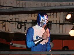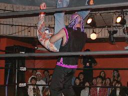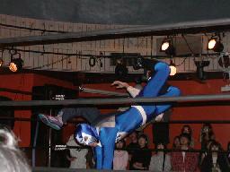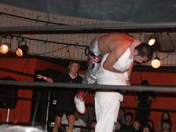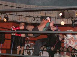 コニカマンコーナーに上る。フラフラと立ち上がるエロエロにスーパーコニカキック(コーナーからダイブしてのダブルニーアタック)。最後はコニカスプラッシュ(左写真)、カウント3。