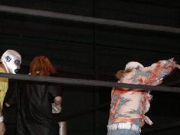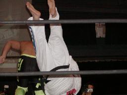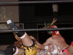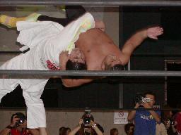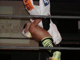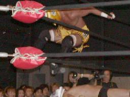 クーガーはエプロンから「昭和」の首を出してもう一発ロープ越えギロチン(左写真)場外で「昭和」の上にイスを積み重ねてトペ・アトミコ。コンドルは80をサードロープの上に寝せてコーナーの反動を利したダブルフットスタンプ。これはいい。