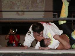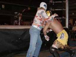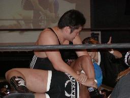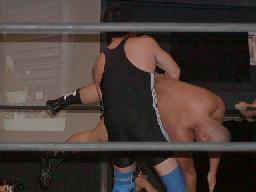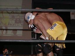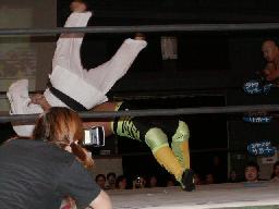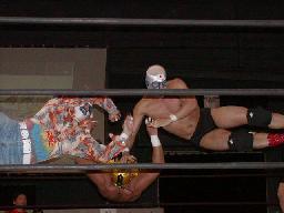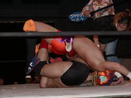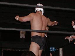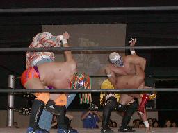 ロックアップから腕の取り合い、「昭和」アームホイップで投げる。クーガーヘッドロック(右写真)、「昭和」切り返す、クーガー戻す。「昭和」エルボー入れてロープに振る、クーガータックル。クーガーロープに飛ぶ、「昭和」リープフロッグで飛び越えてドロップキック。2発目はクーガーかわして逆にドロップキック、「昭和」場外転落。クーガートップロープ越えのトペコン、「昭和」をリングに戻してコンドルにタッチ。