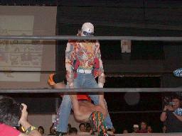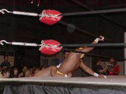 「昭和」コンドルの足を取ってドラゴンスクリューからリバースデスロック、当然のように腰クネをやろうとするが(右写真)80が「俺が父さんに叱られるよ!」と止める。が、アニキは無視して腰クネ。