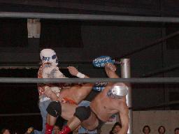 80がコンドルをロープに振ってパンチ、ダブルのドロップキック。コンドル場外転落。「昭和」兄弟はクーガーにダブルのフライングクロスアタック、クーガーも場外転落。「昭和」兄弟プランチャの競演。