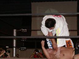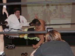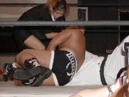 藤沢パンチ、キック、ストンピングの猛攻。タッチしようとするが石井「行け!」藤沢ケサ固めに(右写真)、橋本ヘッドシザーズで切り返し腕を思いっきりひねる。前川にタッチ。