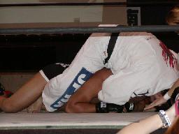 試合前、決勝進出の可能性がなくなって落ち込んでるのか橋本は押し入れの上の段で放心状態、前川は下の段で引きこもり状態。石井は藤沢のちょっとだけ伸び始めた頭にタオル引っかけて引きずっていく。先発は橋本と藤沢。橋本パンチで先制、藤沢もパンチ狙うが橋本かわしタックルで倒してマウントパンチ(左写真)。一旦ブレーク。藤沢タックル、橋本難なく切る。橋本ロープに詰めてボディにパンチ、コーナーに投げつけて石井を挑発。しかし石井は出ない。藤沢パンチ、橋本キャッチしてコーナーに押し込む。今度は石井タッチして出てくる。