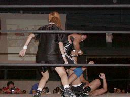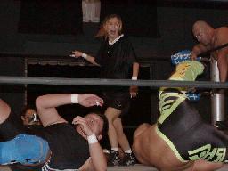 入場前のインタビュー。クーガー「これに勝って、決定戦も勝って、集会だ!」コンドル「新アジアン5ヶ条披露するぜ!」「One Night Gigolo」で入場の「昭和」兄弟。今日のツッコミはグレース(右写真)。アジアン・エキスプレスが先制攻撃をかけるが、「昭和」兄弟はフライングクロスアタックでアジアン・エキスプレスを場外に落とす。