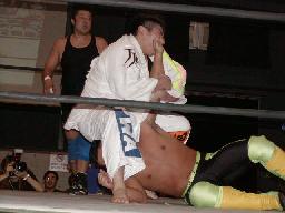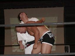 バックの取り合い、石井急所蹴りから投げっ放しジャーマン、カウント2。藤沢にタッチ。石井コーナーに橋本を振る、藤沢と石井串刺しラリアット。石井対角線に振る、藤沢パワースラム。石井は前川を場外に落とす。藤沢ラリアット2発(左写真)、カバー、カウント2。