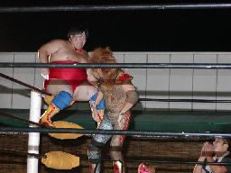 ポイズン太をターンバックルにぶつけてコーナーに上げようとする。重くて上がらない。ポイズン腹にクロー、これをいやがる太が徐々に上がっていきコーナートップに(右写真)。ポイズン蛇界ノクラズム狙う、投げられない。ポイズン雪崩式ブレーンバスターに切り替える、しかし太につぶされる。ポイズンラリアット、太かわし、ロープに飛んでニールキック、金村にタッチ。